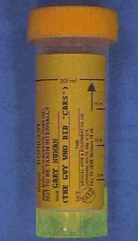 As is generally known, Gary Numan had to make a forced landing in India during his Round The World flight. What's not so well known is that during his period of house arrest, when the authorities thought he might be a spy, Gary was forced to provide a urine sample. Part of it was used for analysis (negative for cocaine etc, positive for Walls' Pork Chipolatas), and the rest was simply left in the vial. In 1983 I was able to track down the official responsible for the storage of Gary's sample and I persuaded him, by threatening his wife and children, to hand it over to me. Although it is now over 20 years old and very smelly indeed, it is my most prized possession and I wouldn't part with it for any amount of money. |